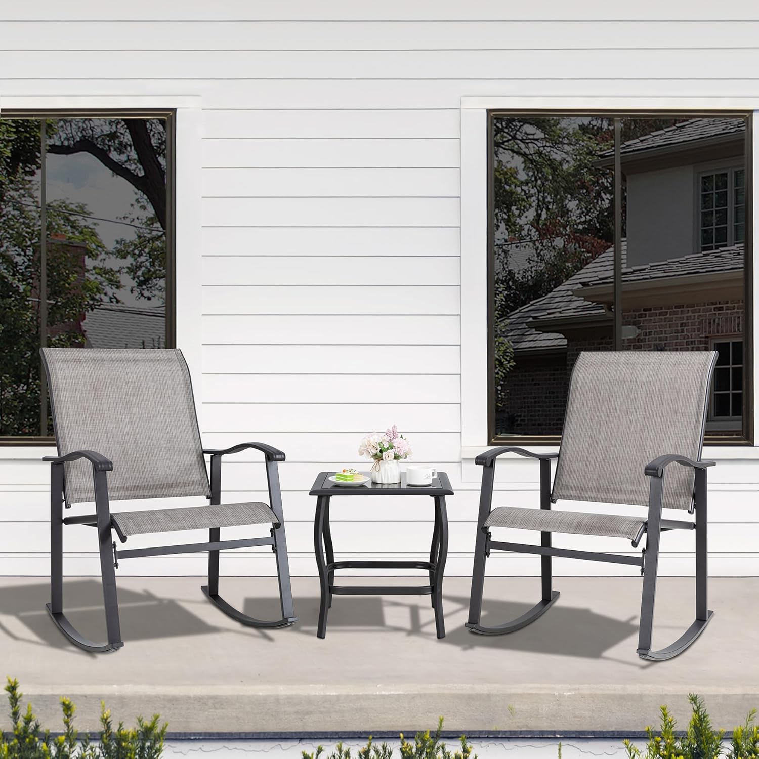 Shintenchi 3 Piece Rocking Bistro Set, Outdoor Furniture with Rocker Chairs and Glass Coffee Table Set of 3, Balcony, Porch Furniture for Small Space, Gray