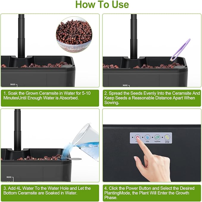 - 【What You Can Get 】Hydroponic Growing System x1(seeds not included), Power Adapter x1, Plant Basket x1, Clay Pebbles x1 Bag, A&B Plant Food x1, Plant Food Refill x1, User Manual x1, Tweezers x1, Silicone Plug x2.