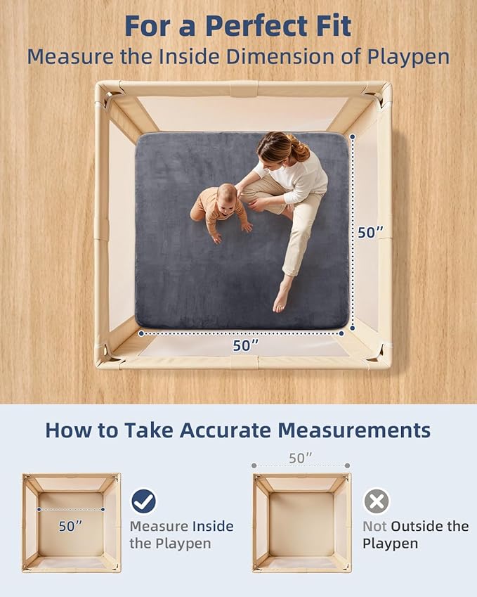 - Soft & Safe Play Area: The back of the play mat features a non-slip design to ensure the mat stays securely in place. This allows your baby to play and grow in a completely safe and comfortable environment. The crawling mat measures 50x50x1.2 inches, making it perfect for a 50x50 baby playpen. The thickened mat protects children during playtime, encouraging them to explore boldly without fear of falls and bumps. The simple design perfectly complements any style of playroom.