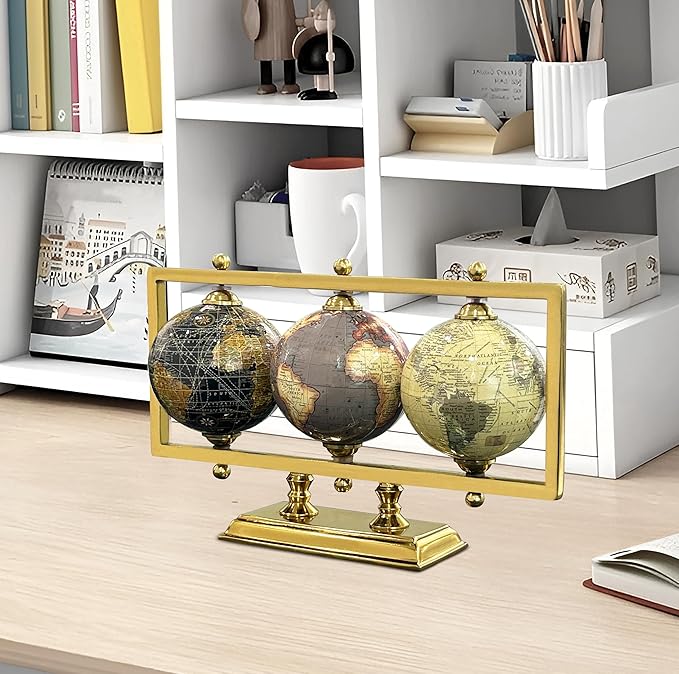 Rely+ Set of 3 4'' World Globes Sturdy Metal Gold Stand (NOT PLASTIC!) - Rotating Desktop Globe For Geographic Home Decorative Desk Table Office Gift - Book Shelf Decor World Globe - Landscape