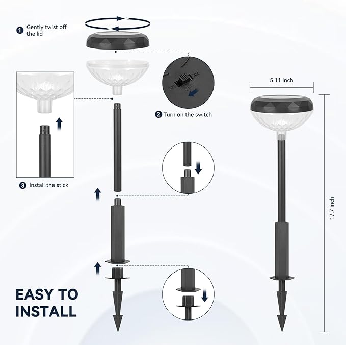 - 2 Install Ways & Solar Powered & Maintenance-Free: Easy setup - use as ground lights with stakes or place on flat surfaces. 100% solar-powered, these lights auto-charge by day and illuminate at night. Designed for practicality, they save labor and reduce electricity bills. Enjoy hassle-free, eco-friendly outdoor lighting for your backyard and lawn.
