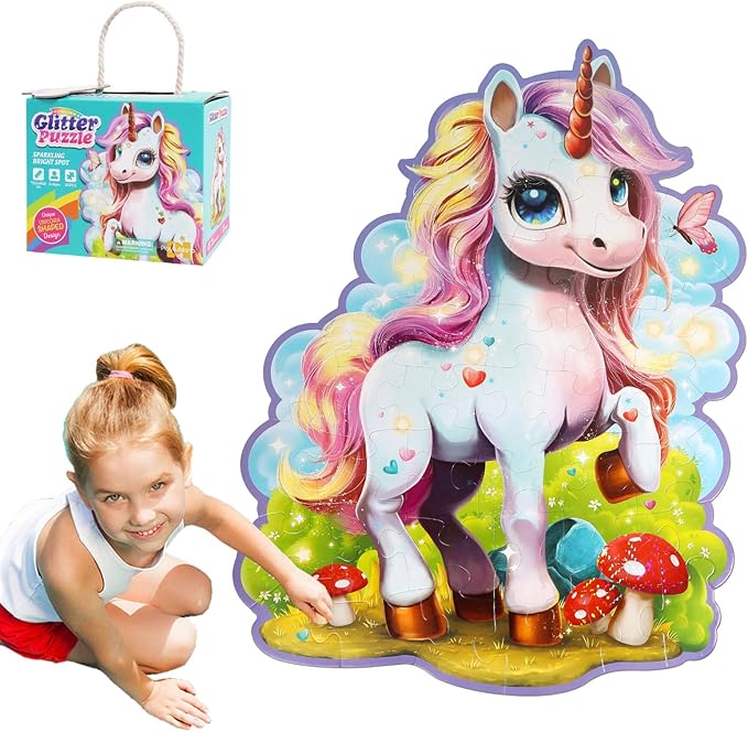 - [Magical Unicorn Puzzle with Glitter Accents] This enchanting 45 piece unicorn puzzle brings a world of magic to life. Featuring glittering accents that shine as children piece it together, it's ideal for kids puzzles ages 3-6. It engages young imaginations while helping develop fine motor skills, problem-solving, and concentration.