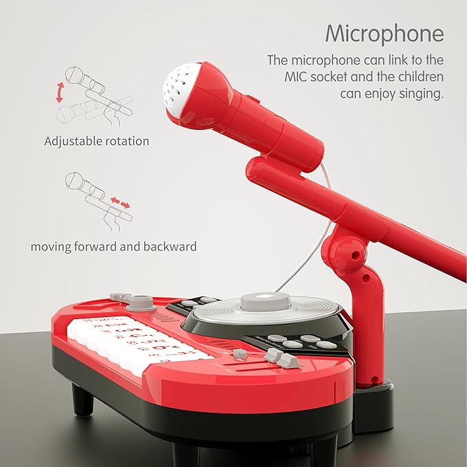 - [Toddler DJ Mixer Piano Toy Functions] 8 keys toy piano keyboards,8 pieces of drum sounds, 8 rhythms, 2 kinds of timbres,10 rhythmic lights, 8 demo songs, high and low volume adjustment and rhythms switching, DJ disc, Karaoke singing with microphone, support MP3 and mobile phone inputs.