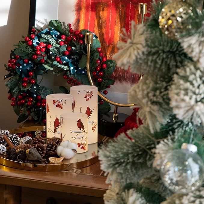 Cardinal Flameless Candles, 3 Pack LED Flickering Pillar Candles with Red Bird Decals, Real Wax Cardinal Home Decor for Halloween Christmas Decor(D3” x H4”5”6”)