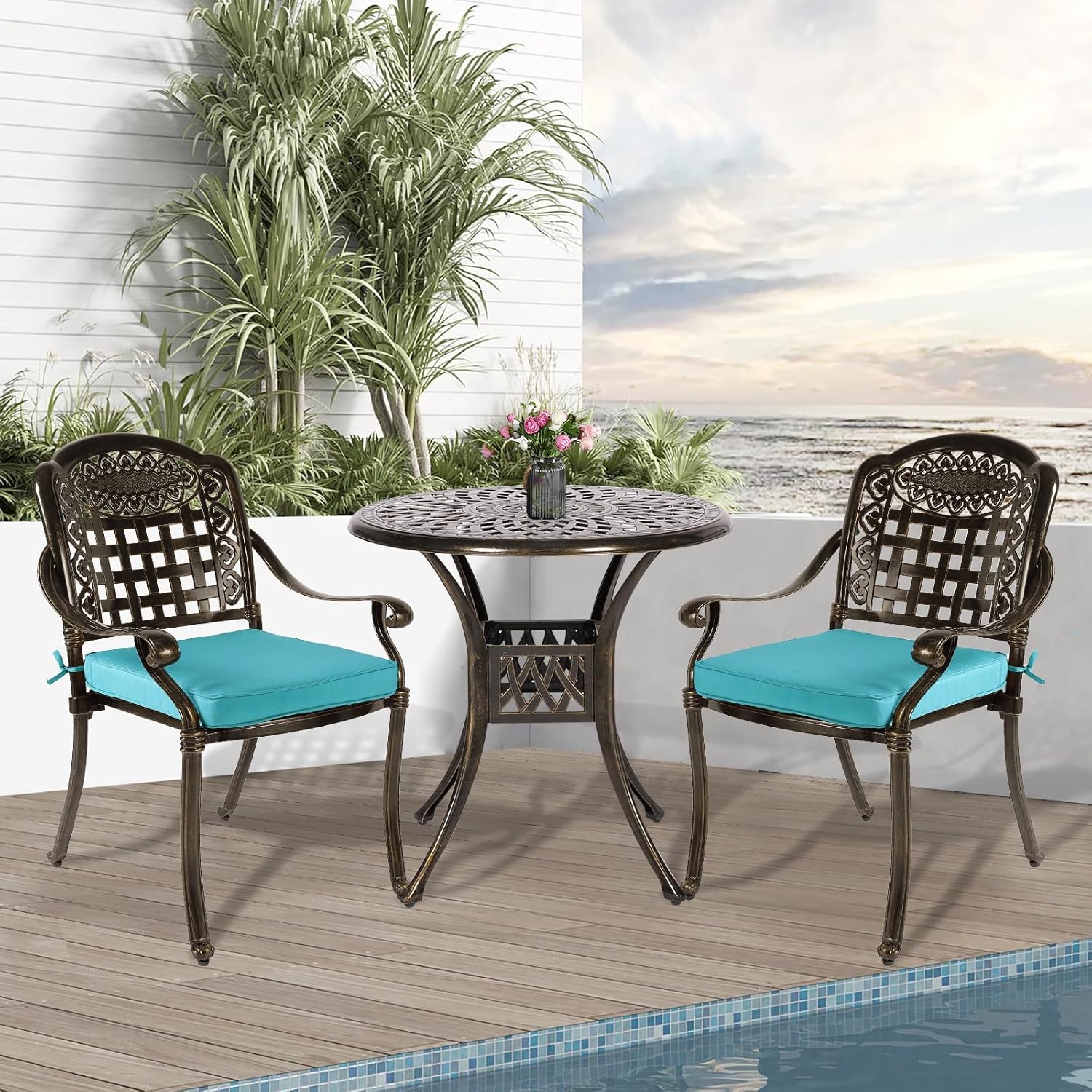 3-Piece Outdoor Patio Dining Set, All-Weather Cast Aluminum Patio Furniture Set for Backyard Garden Deck with 2 Cushioned Chairs and 31” Round Table, 2" Umbrella Hole, Ocean Blue