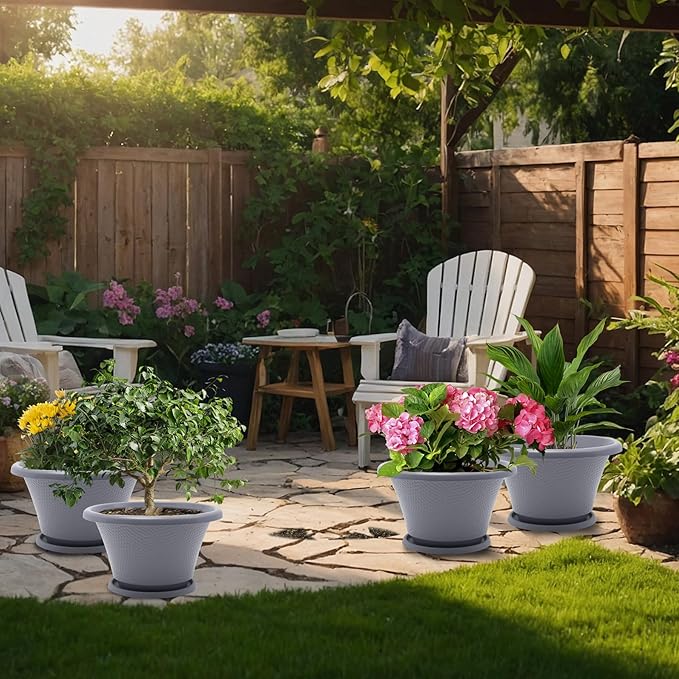 Quarut 12 Inch Large Planter Pot for Plants Indoor Outdoor, 4 Pack Plastic Flower Pots with Drainage Hole & Tray, Modern Decorative Garden Pot with Saucer, Plant Container for House Grey
