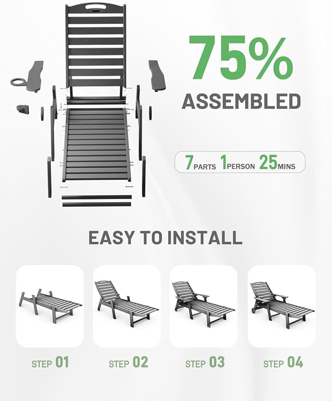 - Premium Suunyn HDPE: The polywood chaise lounge are made from high-density HDPE, which bends slightly under heavy weight or high temperature but returns to its original shape when the weight is removed or the temperature has dropped. This durable material withstands harsh weather and is easy to clean