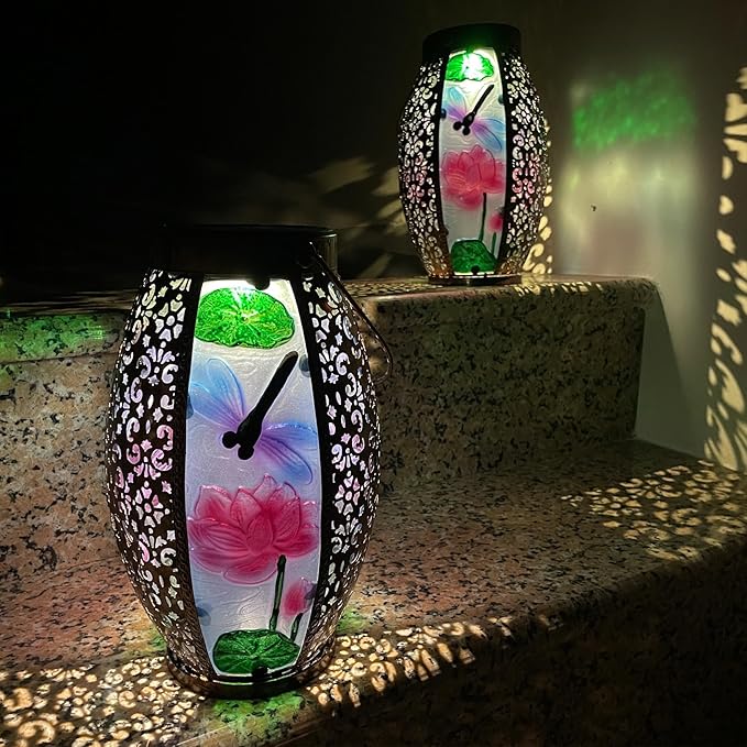 - Package Includes & Large Size: You get 2 retro solar lanterns and 2 shepherd's hooks; Outdoor solar lanterns are 6.3"W * 16.14"H; They not only have brightly colored hot-melt glass with dragonfly patterns but also vintage metal with cutout patterns