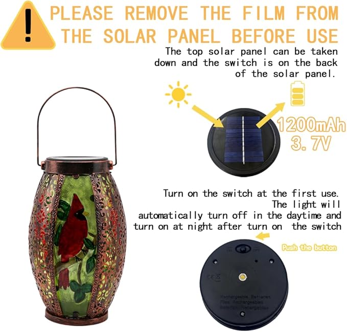 - Easy to Use: The film on the solar panel can be torn off; Before using for the first time, please remove the solar panel and press the switch behind the solar panel to turn it on; Solar table lantern automatically charges during the day and lights up at night