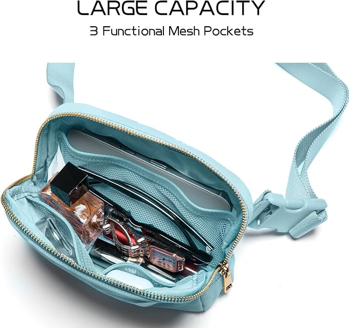 - [Keeps your stuff in order] To help you organise your daily essentials and keep everything you need close to hand, the Everywhere belt bag has two zipped pockets and three mesh pockets. It holds your cellphone, wallet, keys, lipstick, sunglasses and other essentials.