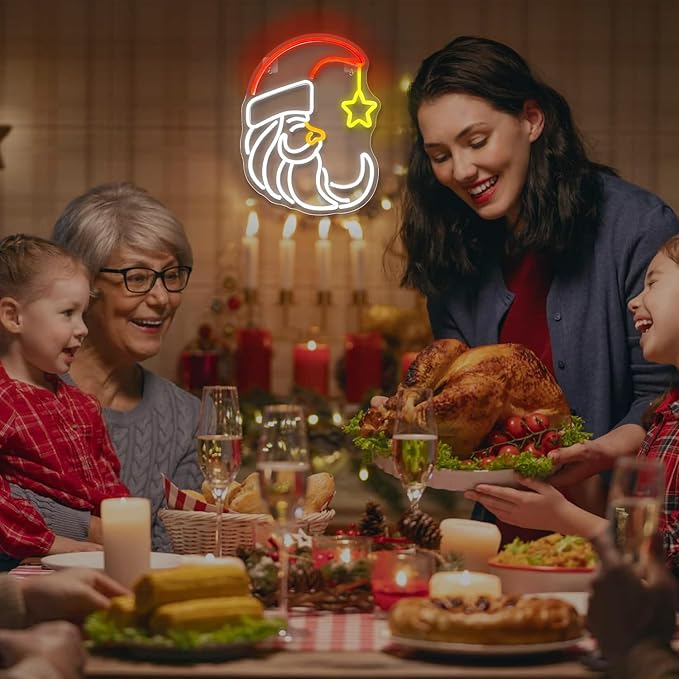 - Bright and Safe LED Illumination:Powered by premium LED lights, this funny Santa neon sign delivers a crisp, brilliant glow that enhances the holiday spirit in any room. The white lamps and yellow nose contrast beautifully against the red hat, creating a vivid and eye-catching display. The LED signs are energy-efficient and cool to the touch, ensuring safe, long-lasting use throughout the holiday season.