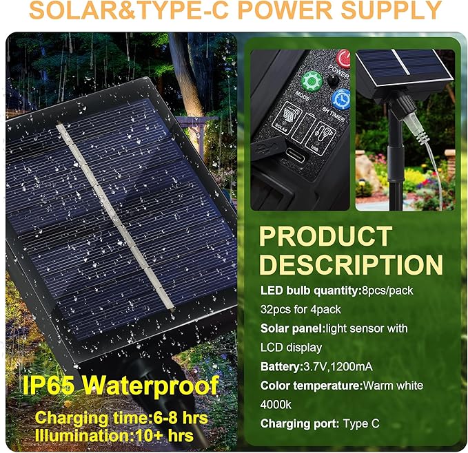 - 【EASY to USE and NO WIRES NEEDED】 Just attach the lights to the included metal ground stake, switch it to the "ON" position, and place it in a sunny spot. The solar panel will charge automatically, and the lights will illuminate at night. After 6-8 hours of charging, they can shine for 10+ hours