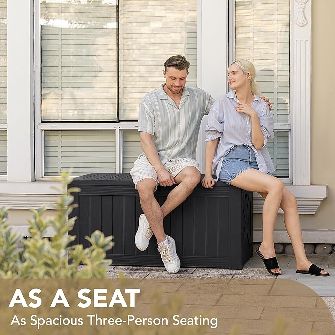 - High-quality Resin: The deck storage box is made of water-resistant resin, complemented by a wood like grain design that maintains a fresh look even with all-weather use