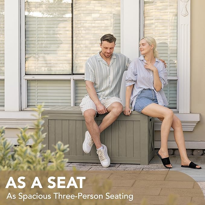 - High-quality Resin: The deck storage box is made of water-resistant resin, complemented by a wood like grain design that maintains a fresh look even with all-weather use