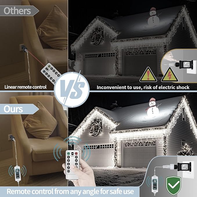- Remote & Button Controller: Our outdoor icicle lights offer dual control for ultimate convenience. Operate them using the transparent button controller or the included remote control, with a range of up to 10m/33ft. Simply plug in and enjoy effortless control. The upgraded memory chip within the button controller enhances remote responsiveness, allowing seamless 360-degree operation from any angle.