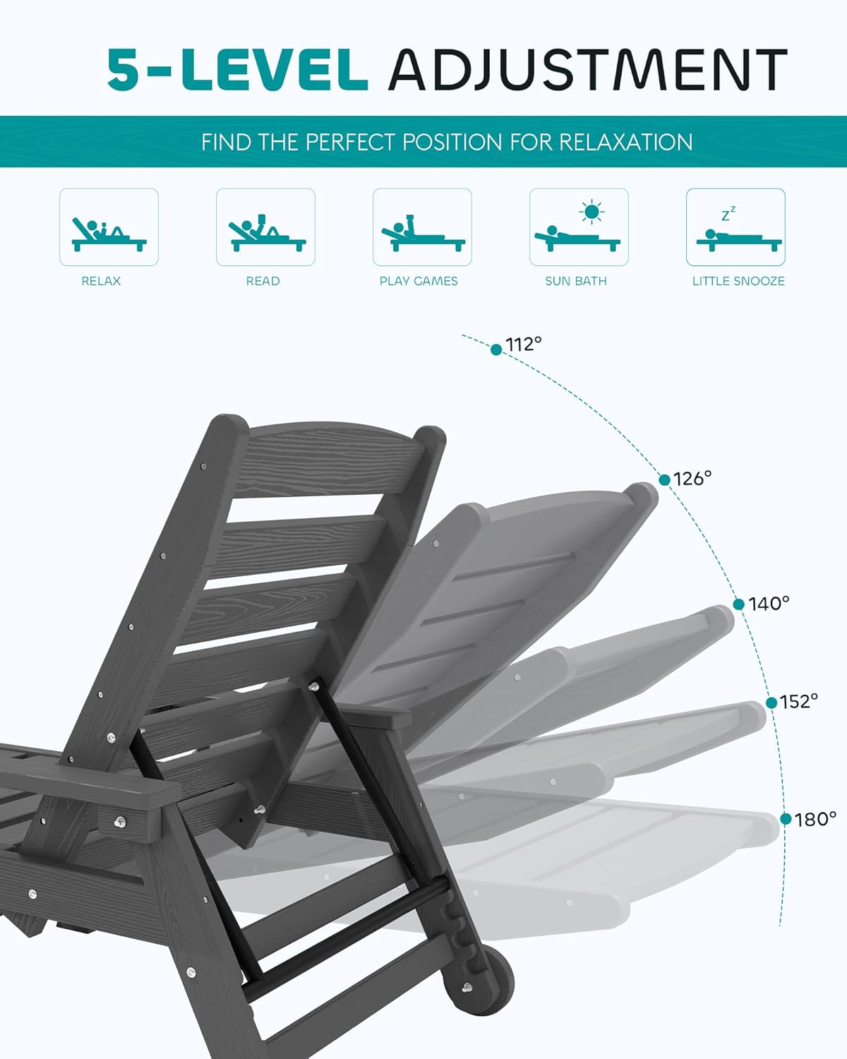 - Modern Stylish: Our HDPE adjustable patio lounge chair with wheels is available in a variety of colors, allowing you to choose one that complements your outdoor decor. Its modern design adds both comfort and practicality to any outdoor space.