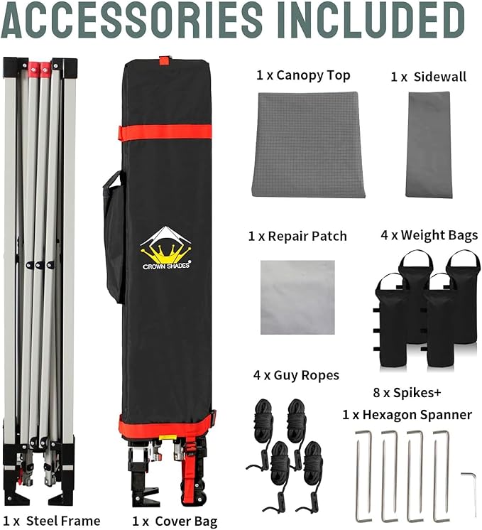 CROWN SHADES 10x10 Pop Up Canopy with 1 Side Wall - Beach Tent with One Push Setup - Outdoor Sun Shade for Events, Parties, Camping - Gazebo with STO-N-Go Cover Bag (Grid Grey)