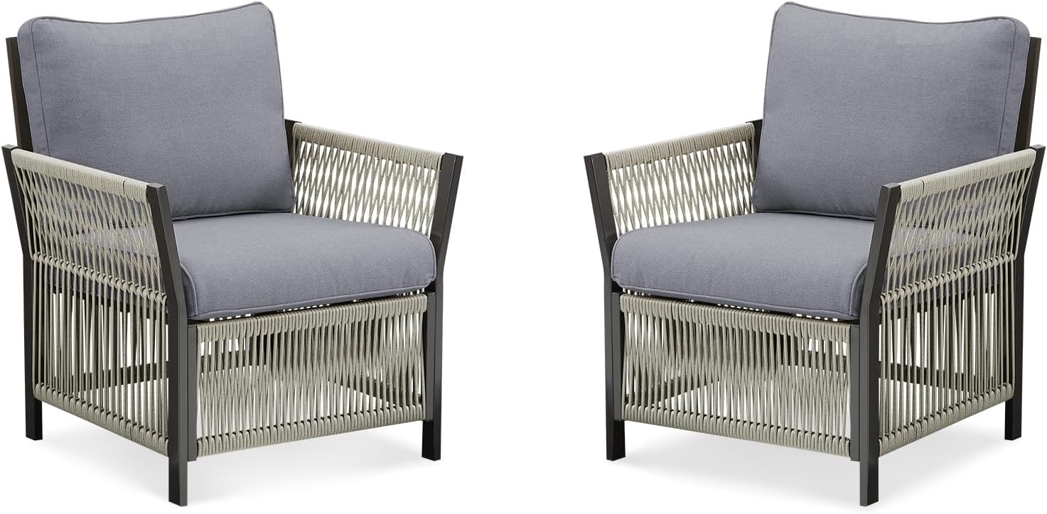 - Modern Minimalist Design: This modern outdoor furniture set stands out with its minimalist design, combining faux rope rattan and exposed metal tubing for a sleek look. Unlike the bulky full-width rattan designs, this set offers a lighter, more refined aesthetic. The contrast between the exposed tubing and the rattan color adds a contemporary touch to any outdoor patio furniture set