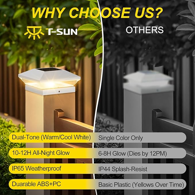 - [6-Pack Bundle, Light Up Your Entire Outdoor Oasis] Transform your yard, patio, or flower beds with a 6-pack of solar deck post cap lights! Backed by T-SUN's 24/7 U.S. support and a 2-year warranty, enjoy peace of mind with every purchase. Elevate your home’s curb appeal!