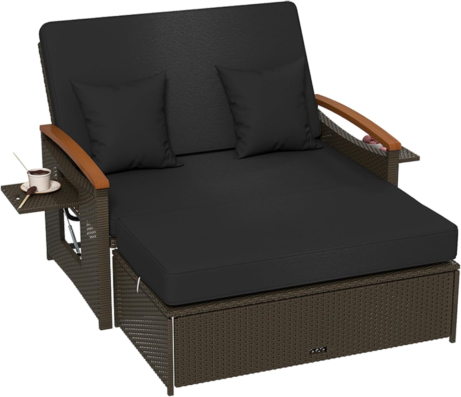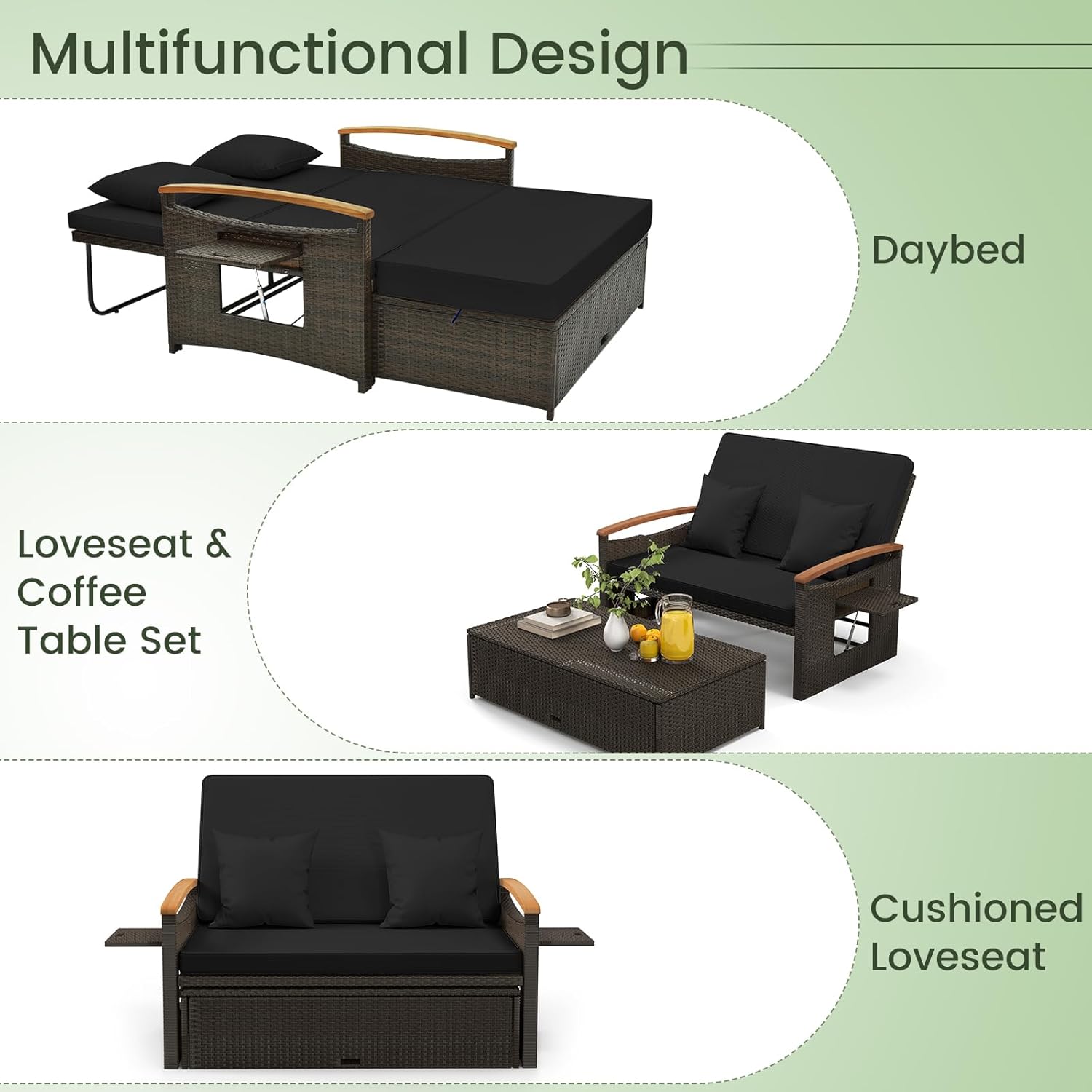 Tangkula Patio Rattan Daybed Set with Cushioned Loveseat and Storage Ottoman, Outdoor Double Chaise Lounger with 4-Level Adjustable Backrest and Retractable Side Trays for Backyard (Black)