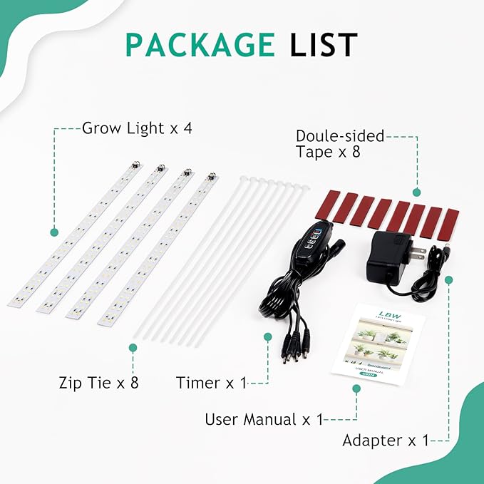 - 【Two Installation Methods】Provide zip ties and double-sides tapes, so you can install lights with zip ties or double-sides tapes on your shelf.【Package Content】1 Pack: grow light stripx4;adapterx1;timerx1;zip tiex8;doule-sided tapex8 (size of one light strip is 13"x0.63")