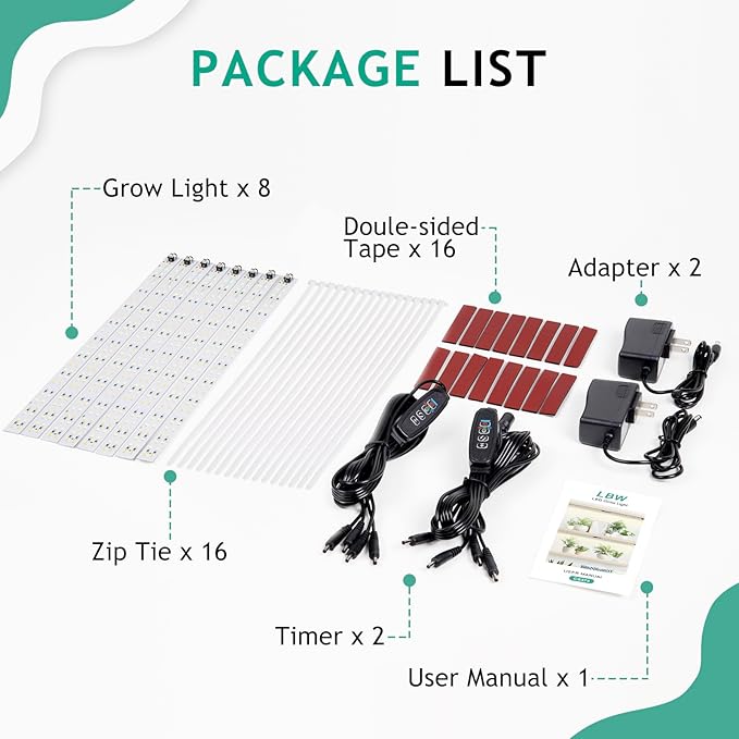 - 【Two Installation Methods】Provide zip ties and double-sides tapes, so you can install lights with zip ties or double-sides tapes on your shelf.【Package Content】2 Pack: grow light stripx8;adapterx2;timerx1;zip tiex16;doule-sided tapex16 (size of one light strip is 13"x0.63")