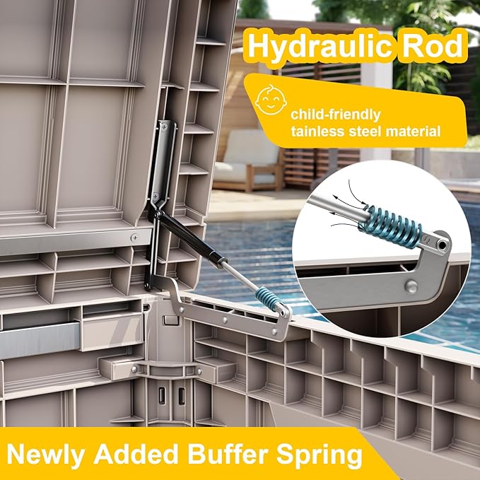 - Safety design: Each deck box has lockable holes (not included) for added security; in addition, the box is equipped with a hydraulic stand, which allows easy opening and slow closing and prevents hand pinching. The outdoor waterproof deck box has built-in handles on both sides, ensuring easy grabbing and moving