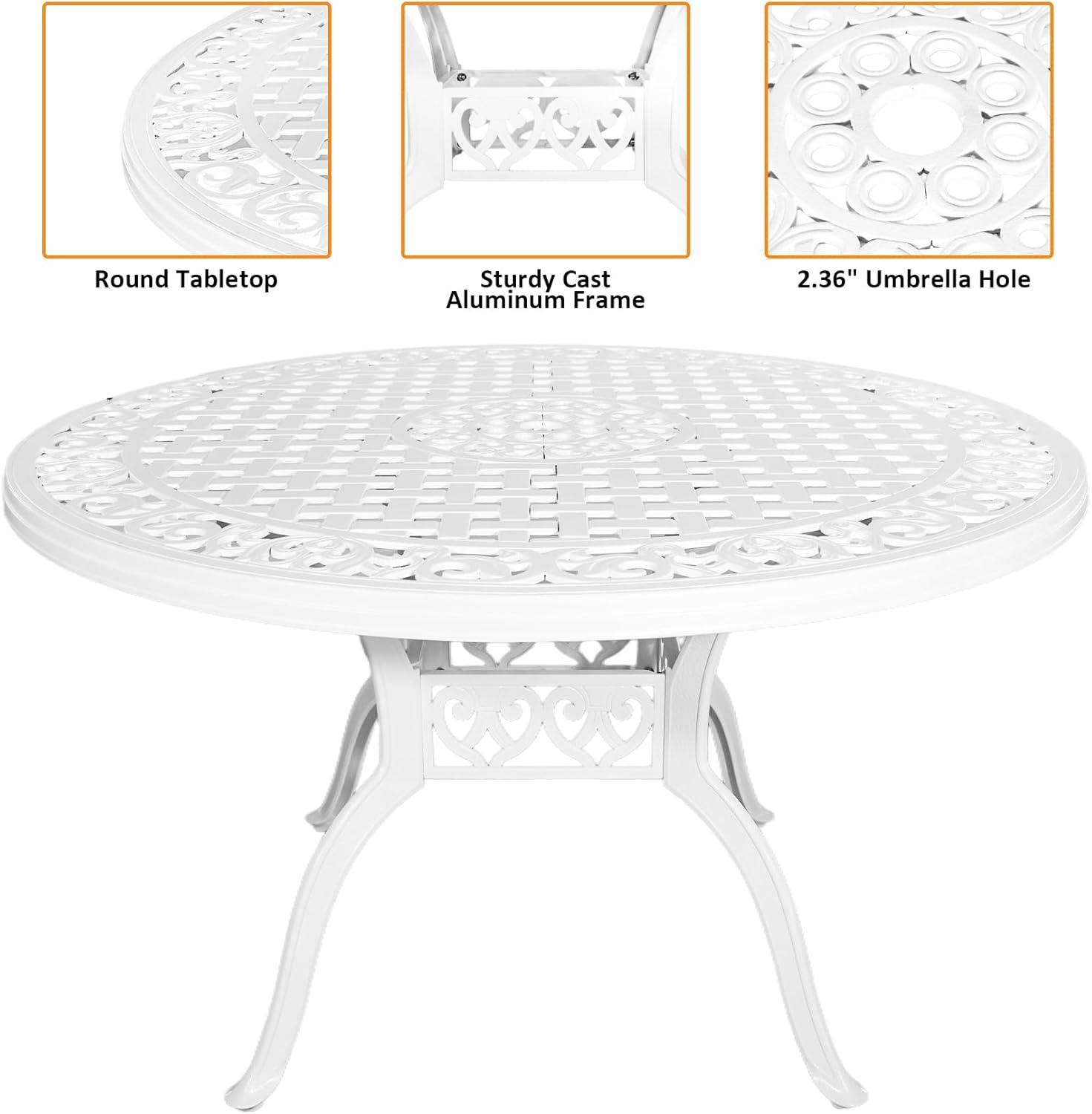 - 【Patio Dining Set for 6】Table : 48"(Dia) x28.4"(H);Table Weight Capacity: 350lbs. Chair: 20.4"(L) x19.6 "(W) x32 "(H); Chair Weight Capacity: 300lbs. This lightweight and durable cast aluminium dining set is perfect for breakfast in the morning or tea for four in the afternoon.