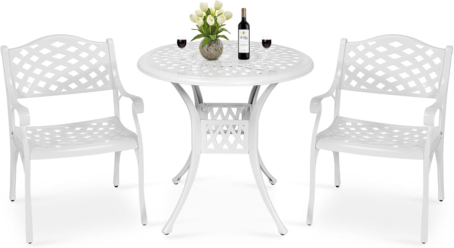 MEETWARM 3 Piece Patio Bistro Set, Outdoor All-Weather Cast Aluminum Dining Furniture Set Includes 2 Chairs and a 31” Round Table with Umbrella Hole for Garden Deck, White