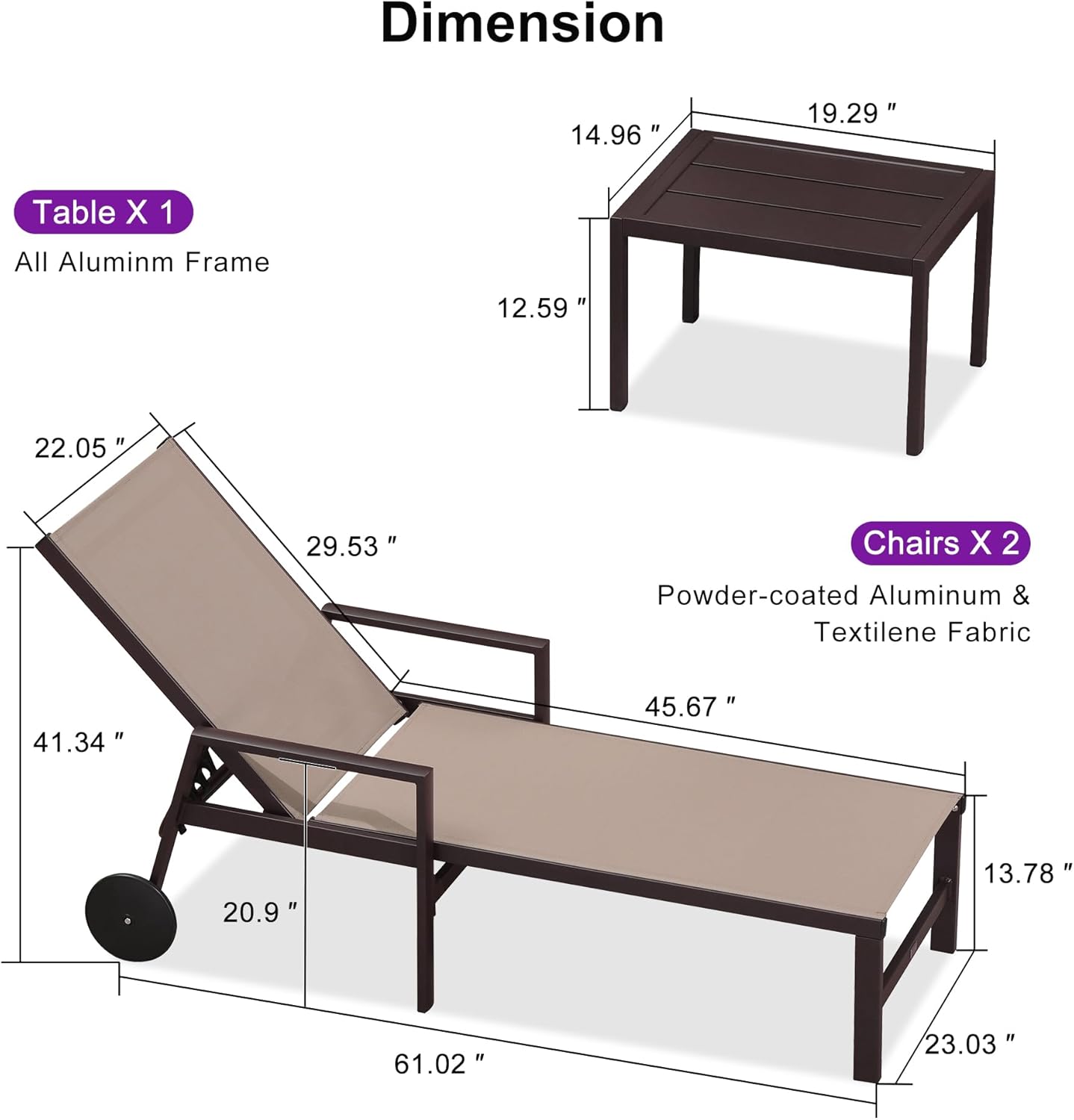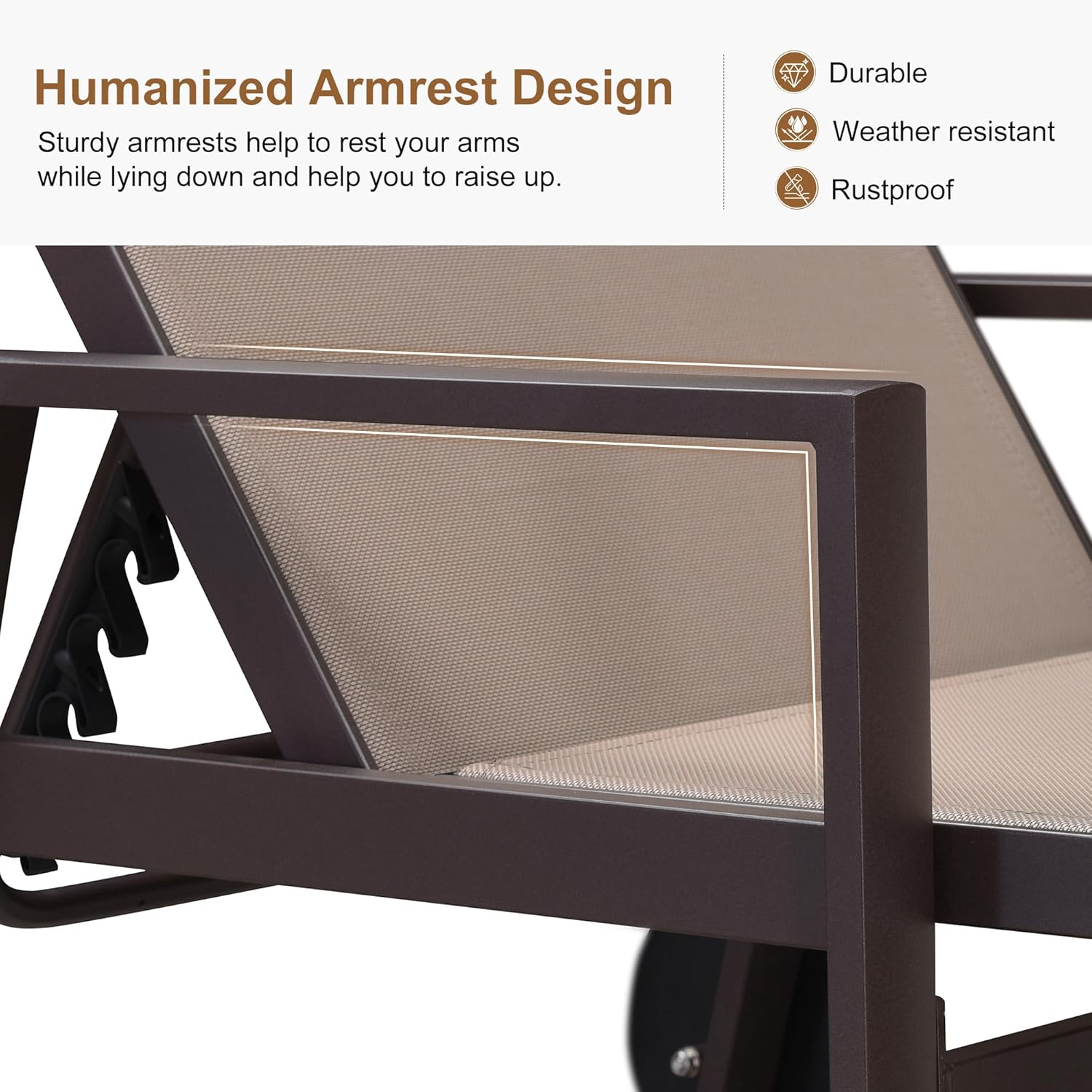 PURPLE LEAF Pool Lounge Chairs Set of 3 Aluminum Outdoor Lounge Chairs with Wheels and Armrests Adjustable Patio for Deck Outside Lawn Garden, Taupe