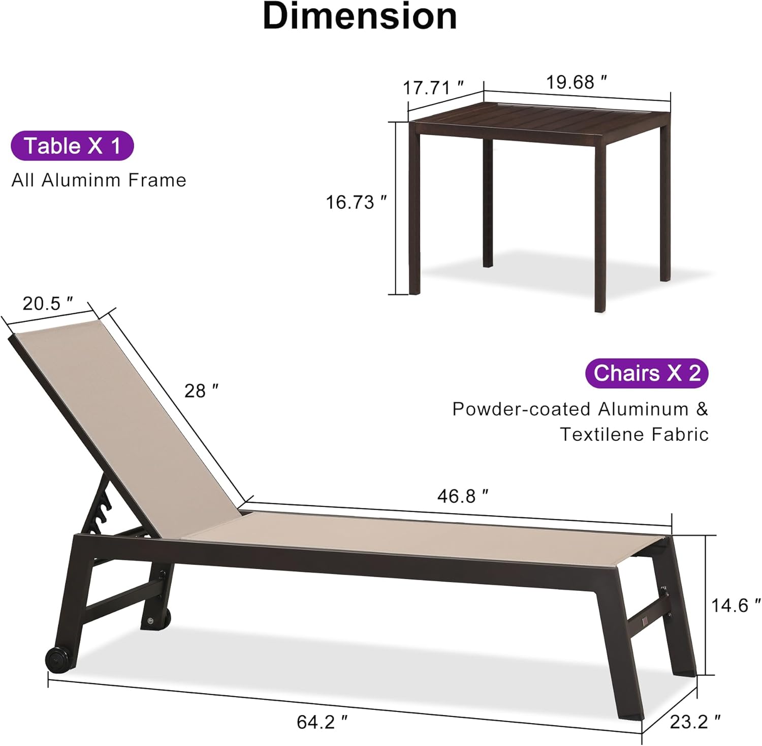 PURPLE LEAF Outdoor Chaise Lounge Chair Set of 3, Pool Lounge Chair for Outside, Aluminum Patio Chaise Lounger with Adjustable Backrest and Wheels for Deck, Outside, Lawn, Garden, Sand Beige