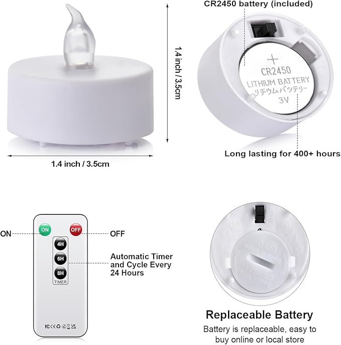 - 1.PACKAGE Includes: 5pcs (D1.4*1.4 inch flameless) Flameless tea lights candles 1 remote control , Each tea light includes a CR2450 battery