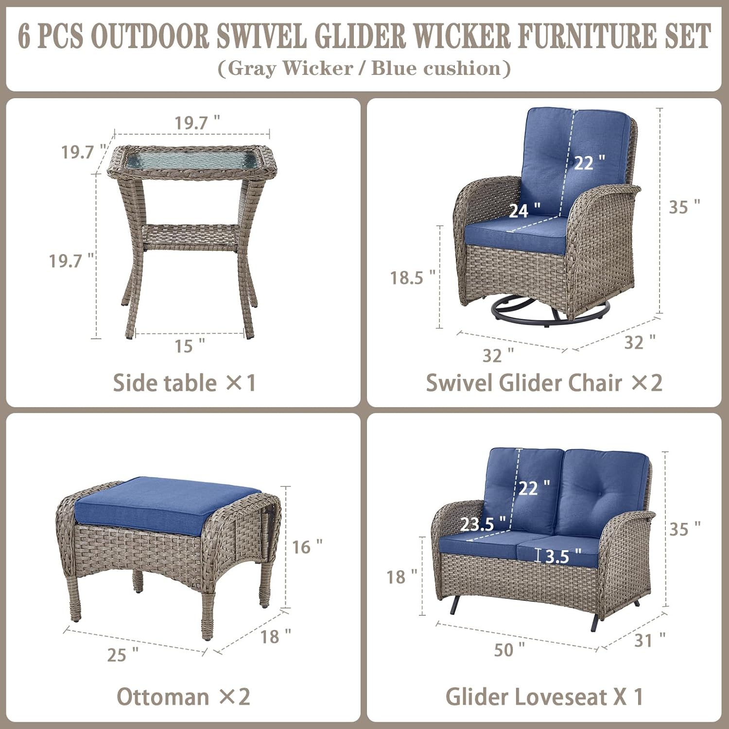 - 1.PATIO CONVERSATION SETS DETAILS: The 6 pcs patio furniture set includes 2 wicker swivel rocker chairs, 1 glider loveseat, 2 ottomans and 1 glass top side table, each chair has a weight capacity of 300 pounds and the side table has a weight capacity of 50 pounds. The brown color wicker with blue cushions in a simple and premium tone is perfect for decorating your patio, porch, balcony, sunroom and other outdoor spaces.