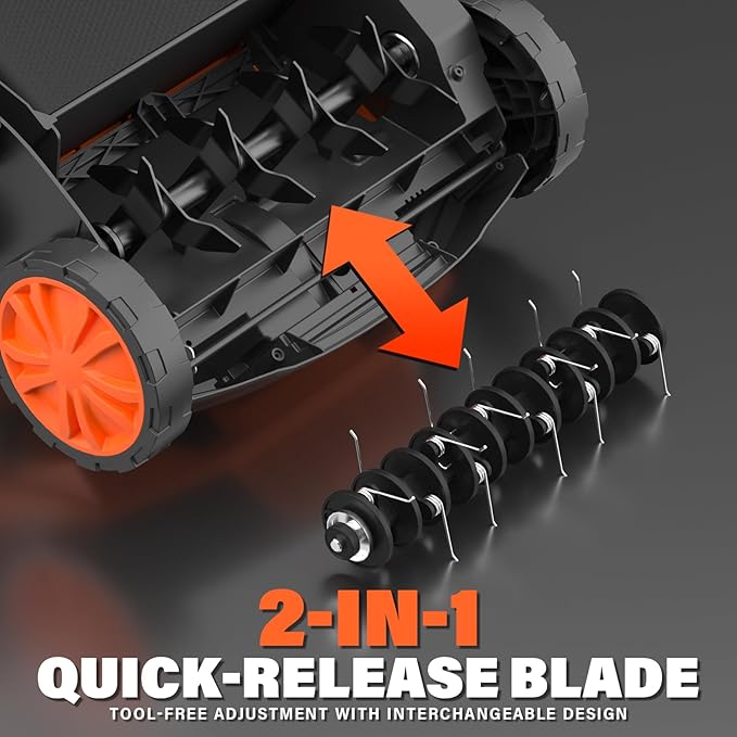 - 2-in-1 Versatility: This lawn dethatcher is equipped with both dethatching blades to remove thick layers of dead grass and scarifier blades to cut through grass roots. It’s your go-to solution for promoting thicker, vibrant grass growth!