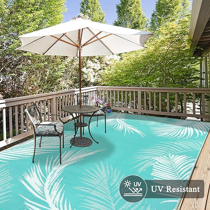 Pauwer Waterproof Outdoor Rug 6x9, Reversible Plastic Straw Patio Camping Rug, Indoor Outdoor RV Mat Carpet for Deck, Camper, Porch, Balcony, Backyard, Picnic, Leaf Light Blue