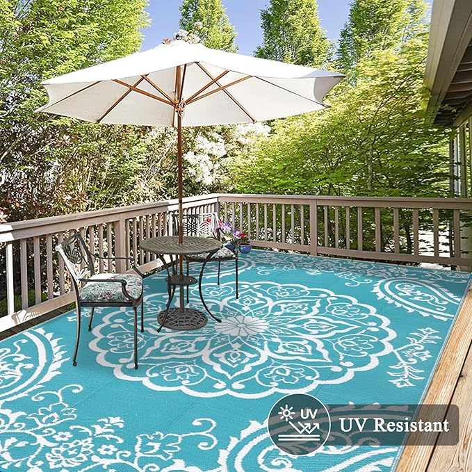 Pauwer Waterproof Outdoor Rug 10x14, Reversible Plastic Straw Patio Camping Rug, Indoor Outdoor RV Mat Carpet for Deck, Camper, Porch, Balcony, Backyard, Picnic, Boho Teal