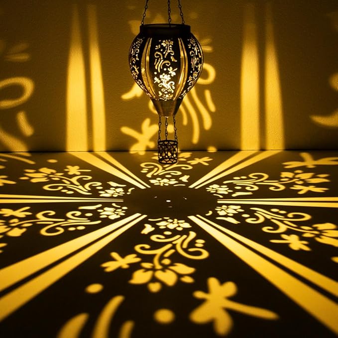Starsoul Hot Air Balloon Solar Lantern with Flower Projection Metal Outdoor Waterproof Hot Air Balloon Solar Lights Hanging Lantern for Garden Yard Patio Decor