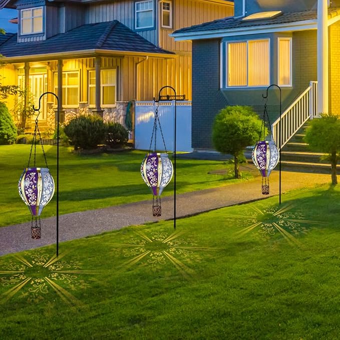 - 【Metal Hot Air Balloon Solar Lantern】The metalwork is not only decorative but also allows light to filter through, casting intricate shadows and creating a mesmerizing play of light and darkness in your garden or patio. This outdoor hanging solar lantern showcases intricate floral and swirl patterns, lending elegance and depth to its design.