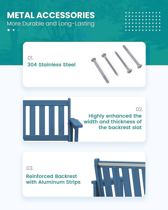 - Reinforced Aluminum Bar: SERWALL garden benches for outdoors are built to last, with sturdy aluminum strips reinforcing the backrest for added durability without compromising comfort. The reinforced chair is more durable and resistant to deformation, ensuring long-term outdoor use.