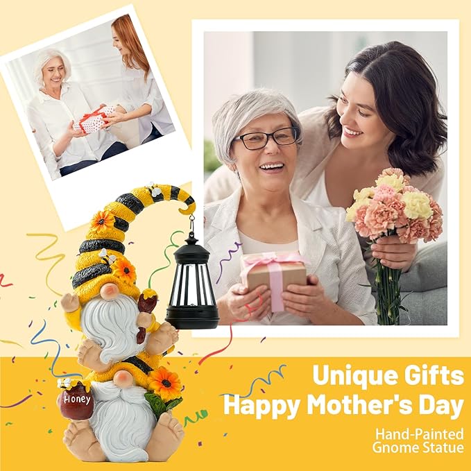 Solar Bee Garden Gnomes with LED Lantern – Waterproof Stacked Outdoor Decor for Yard, Patio – Unique Gnome Gift for Mom, Grandma, Women (Weatherproof Resin Outdoor Statues)