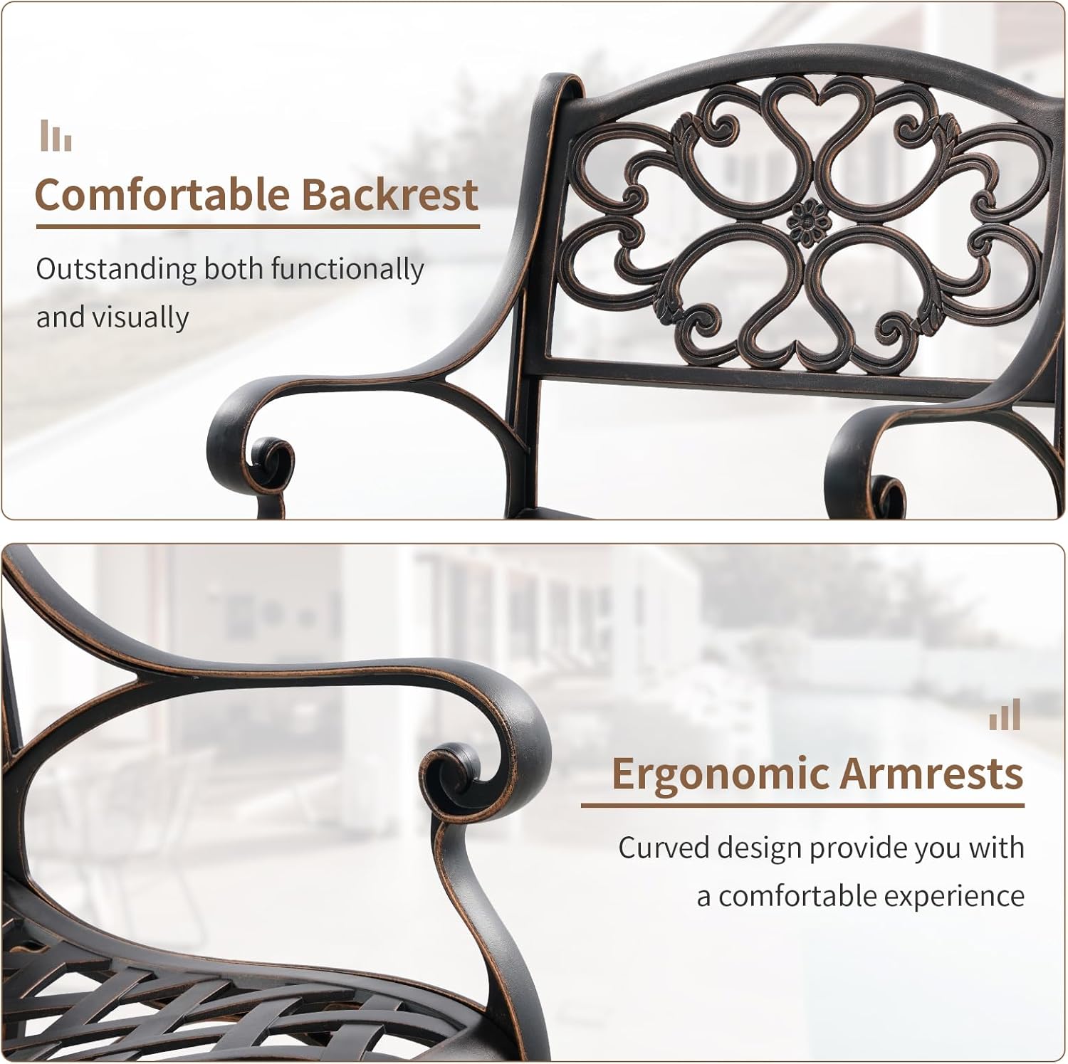 Bistro Set 3 Piece Outdoor Cast Aluminum Patio Bistro Set Patio Set Metal Bistro Table and Chairs Set of 2 with Umbrella Hole for Deck, Gardens, Bronze (Flower Backrest)