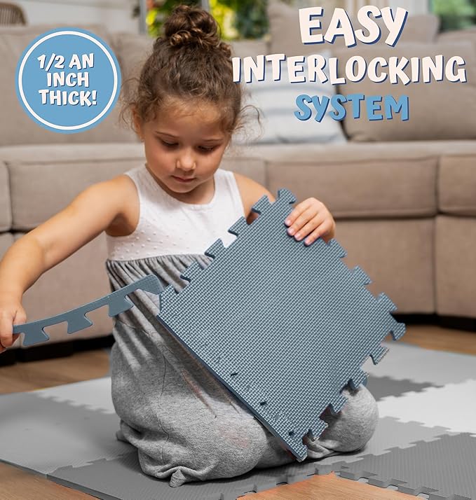 - SIMPLE INTERLOCKING SYSTEM: These kids foam floor tiles have been designed with an easy interlocking design. Easily click the pieces together and pull them apart for a simple way to protect your baby and your floor. It is a must have for any nursery, play area, play room, children’s room, daycare center or school! Now your child can build a puzzle, practice colors, and master the act of sharing with friends! This truly is an all-in-one playroom play mat