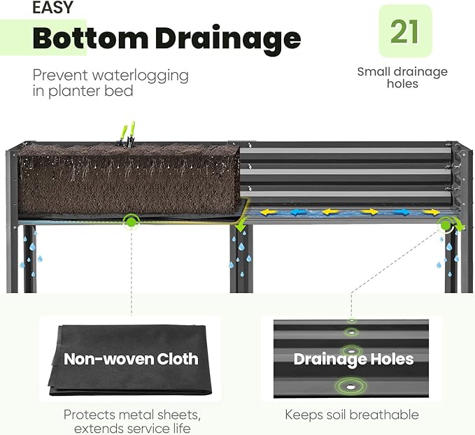 - 【Effortless Drainage】Ample drainage holes allow plant roots to breathe and drain properly. Comes with a non-woven fabric liner to ensure efficient drainage while containing soil, enabling worry-free indoor and outdoor use. The elevated garden bed is ideal for garden, backyard, balcony, and deck.