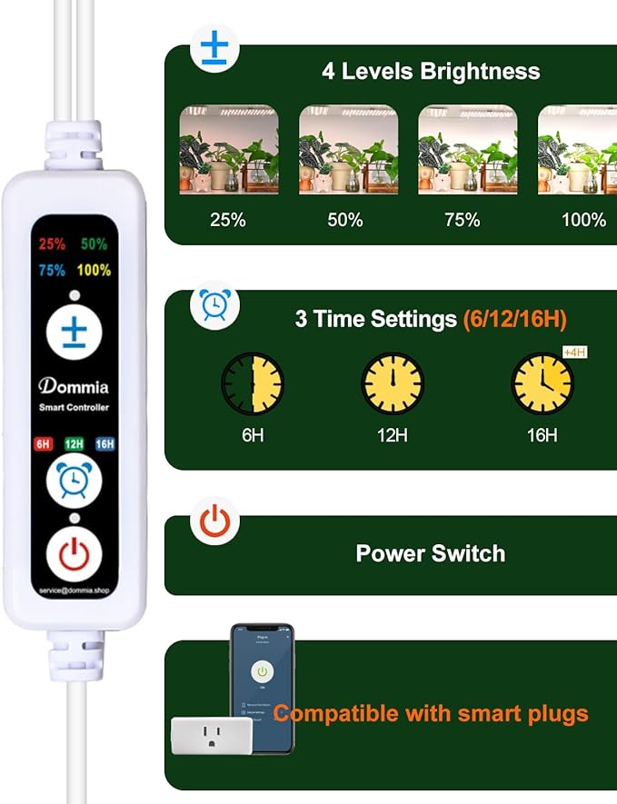 - Dimmable LED Grow Light: Our indoor grow lights for plants are equipped with four adjustable brightness 25%, 50%, 75%, to 100%, allowing you to customize the lighting intensity for your plants' specific needs