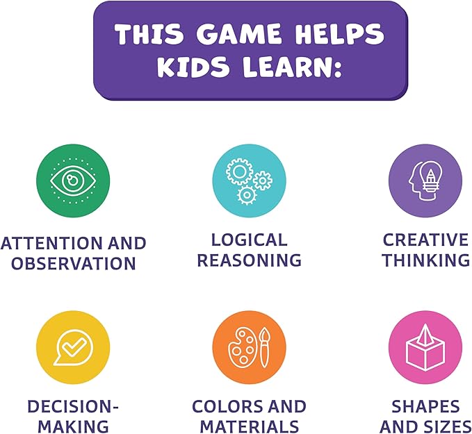 - HELPS LEARNING & DEVELOPMENT – This educational kids game helps to develop observation, logical and creative thinking, phonological and sensory awareness, as well as learn shapes, sizes, colors, and materials in a fun, gamified environment.