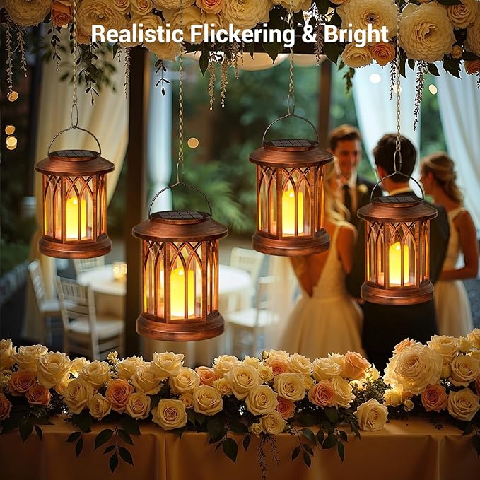 - 【Elegant Design & Dancing Candles】These solar lights outdoor boast a refined and retro appearance, blending medieval Gothic elements seamlessly. Crafted with a unique technique, solar lanterns outdoor waterproof exhibit a natural wood grain effect, exuding a warm and elegant vibe. When the solar lantern is lit, the warm yellow light filters through the geometric gaps of the solar lanterns, the solar candle lantern seems to transport one back in time to an era filled with stories and warmth