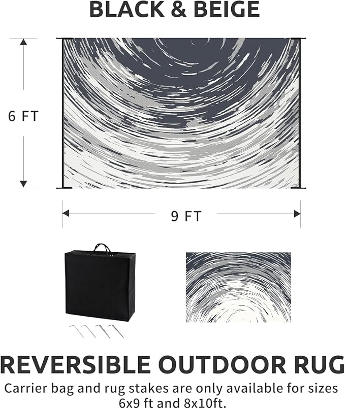 • RV traval&Camping: This camper must haves outdoor rug is ideal for picnics, gatherings, and RV trips! The lightweight outdoor camping carpet with foldable lines is easy to carry and saves space. Includes an extra carry bag and rug stakes for 6x9 ft, 8x10 ft and 9x12 ft. Grass-friendly, durable, and easy to clean, this outdoor rug enhances outdoor adventures.