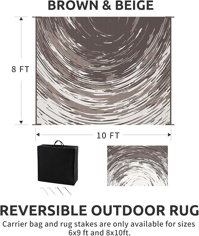 - RV traval&Camping: This camper must haves outdoor rug is ideal for picnics, gatherings, and RV trips! The lightweight outdoor camping carpet with foldable lines is easy to carry and saves space. Includes an extra carry bag and rug stakes for 6x9 ft, 8x10 ft and 9x12 ft. Grass-friendly, durable, and easy to clean, this outdoor rug enhances outdoor adventures.
