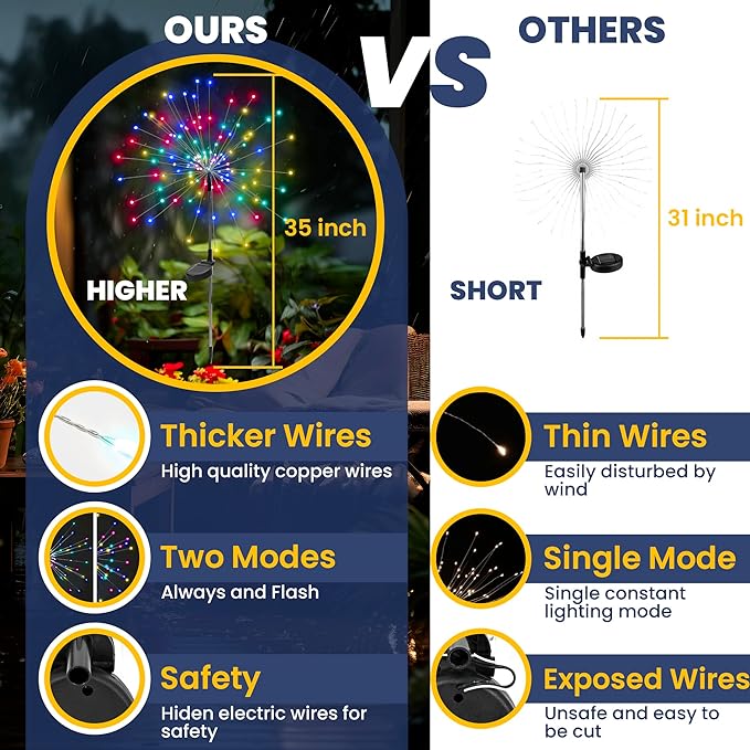 - 【Long Working Time】The led sparkler lights are made with durable low-heat-emission 120 LED, upgraded solar panel and build-in high-capacity rechargeable 1.2V/600mAh AA battery. Standard sunshine charging 4-6 hours in the daytime, working 8-10 hours at night after fully charged