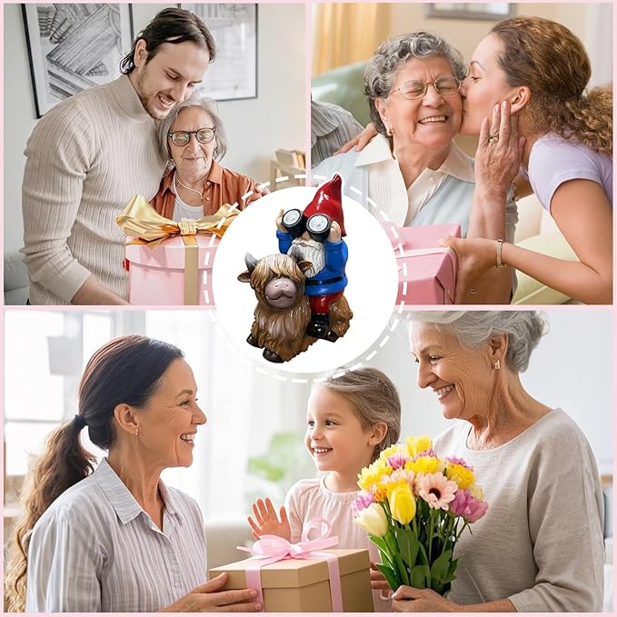 - 🐮Solar Lights Outdoor Statue: This cute and brave garden gnome sits on a highland cow, surveys its surroundings with binoculars, raises finger at enemies to show its anger and determination to defend home, and guards the beautiful garden, adding color and life to garden.Thanksgiving christmas anniversary housewarming gift for mum dad lover colleague friend.